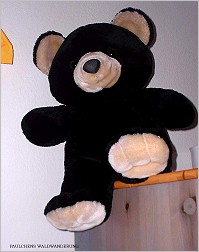 Der Weg wurde steinig und führte bergan - eine große Mühe für einen hier draußen doch sehr kleinen Teddybären. Als er nach unten sah, um den vielen größeren Steinen auszuweichen, vernahm er vor sich ein grauenerregendes Brüllen. Entsetzt schaute er auf und erstarrte zur Bären-Salzsäule. Vor ihm stand ein leibhaftiger riesiger Schwarzbär. Das Brüllen ging in ohrenbetäubendes Lachen über, doch Paulchen wagte sich nicht zu regen, machte sich ganz klein und duckte sich hinter einen Felsbrocken. "Was willst du nachgemachter Knirps hier in meinem Revier?" erkundigte sich der Schwarzbär, "du lächerlicher Zwerg, wagst dich an meine Höhle?" Dabei kam er ganz dicht an Paulchen heran, beschnüffelte ihn ausgiebig und leckte ihm auch sein seidiges Fell naß. Paulchen zitterte vor Angst. "Komm mit in meine Höhle" befahl der Schwarzbär, und Paulchen blieb nichts anderes übrig als zu gehorchen. In der Höhle war es ziemlich finster und roch stark nach Schwarzbär. "Wir Bären müssen zusammenhalten" befand der Schwarzbär und gab ihm deshalb den Rat, den Wald und die Berge doch wieder zu verlassen. Das sei besser für ihn, denn ihm könne er sich nicht anschließen, er sei zu klein, und auch die anderen Bären würden ihn nur als Sonderling ansehen. Da wurde Paulchen wieder ganz traurig, tapste dem Schwarzbär zum Dank dafür, daß er ihm nichts getan hatte, ans Bein und zog seines Wegs. Sollte er noch einen Versuch unternehmen, hier draußen Fuß zu fassen, Freunde zu finden und glücklich zu werden?