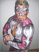 Gewöhnlich bemalt die Künstlerin – Zweite beim Internationalen Face-Painting-Wettbewerb 2006 und Dritte bei der Deutschen Meisterschaft in der Königsklasse Special Effects mit Latex und anderen Hilfsmitteln – zarte Frauenkörper. Doch von dünnen Models hatte sie zuletzt erst mal genug – zu wenig Fläche zur gestalterischen Entfaltung. Warum also nicht einen voluminösen Männerkörper als Grundlage nehmen? „Da ist die Leinwand größer“, schwärmt die 41-Jährige. An diesem Punkt kam ihr langjähriger Bekannter Dietmar Schach ins Spiel. Und schon prallten „zwei Kunstformen“ (Hertfelder) aufeinander. Und harmonierten perfekt. Sechs Stunden lang hat die Vaihingerin den Bodybuilder mit Pinsel und Schwamm bearbeitet und ihn malerisch in eine – sozusagen hautenge – Science-fiction-Rüstung gesteckt.